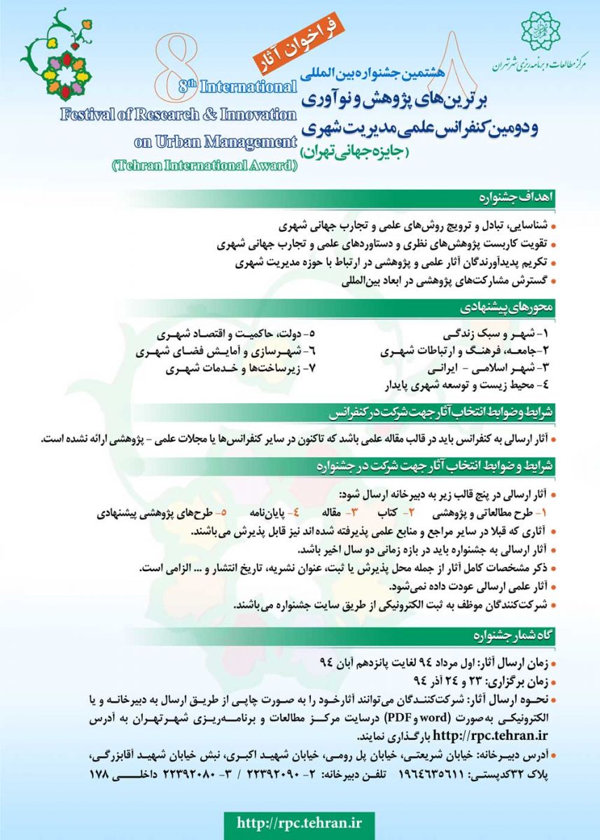 به گزارش روابط عمومی دانشگاه هنر، هشتمین جشنواره بین المللی پژوهش و نوآوری در مدیریت شهری ( جایزه بین المللی تهران ) در تاریخ ٢٣ و ٢٤ آذر ماه سال جاری برگزار خواهد شد.
