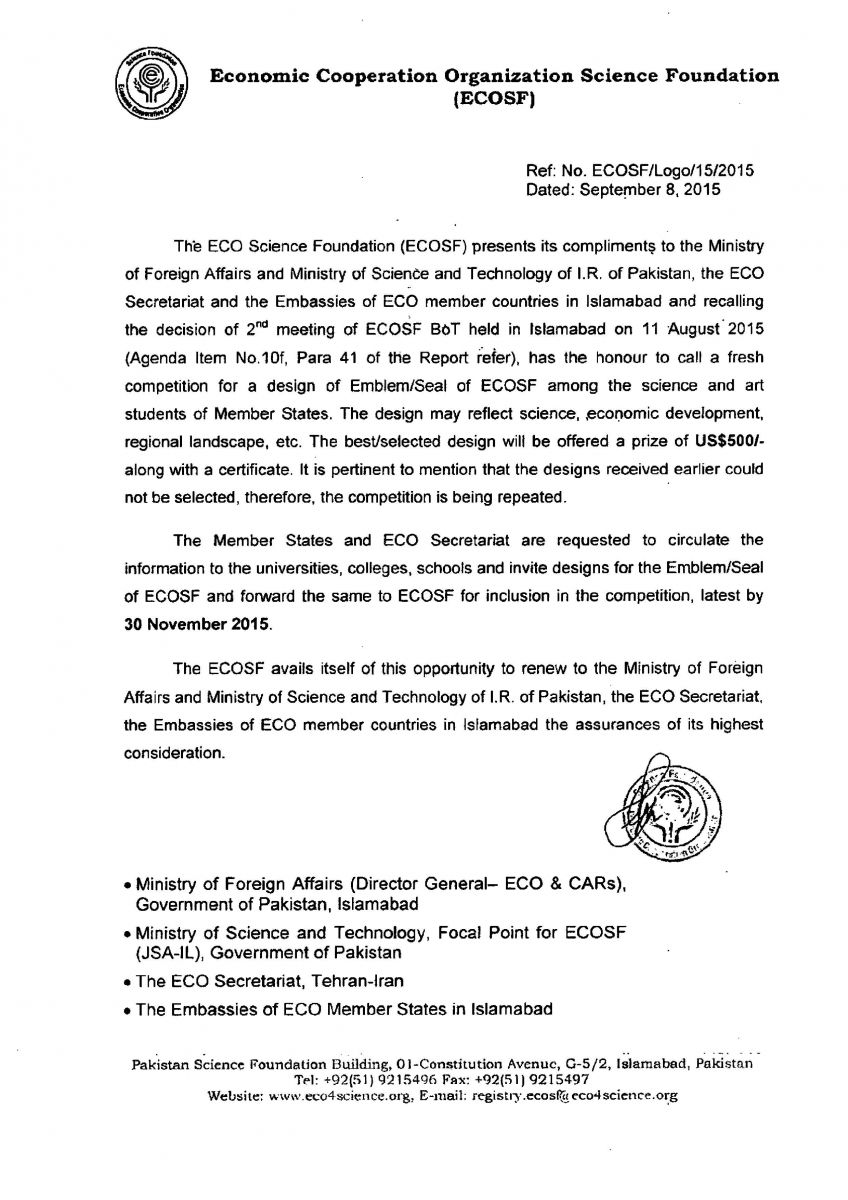 لوگوهای طراحی شده ضمن داشتن شرایط « نمادعلمی » مربوط به حوزه فعالیت های بنیاد، بایستی از نشانه های مربوط به سازمان همکاری اقتصادی (ECO ) نیز برخوردار بوده و حداکثر تا 15 نوامبر 2015 ( ۲۴ آبان ماه ۹۴) به این مرکز ارسال شوند.