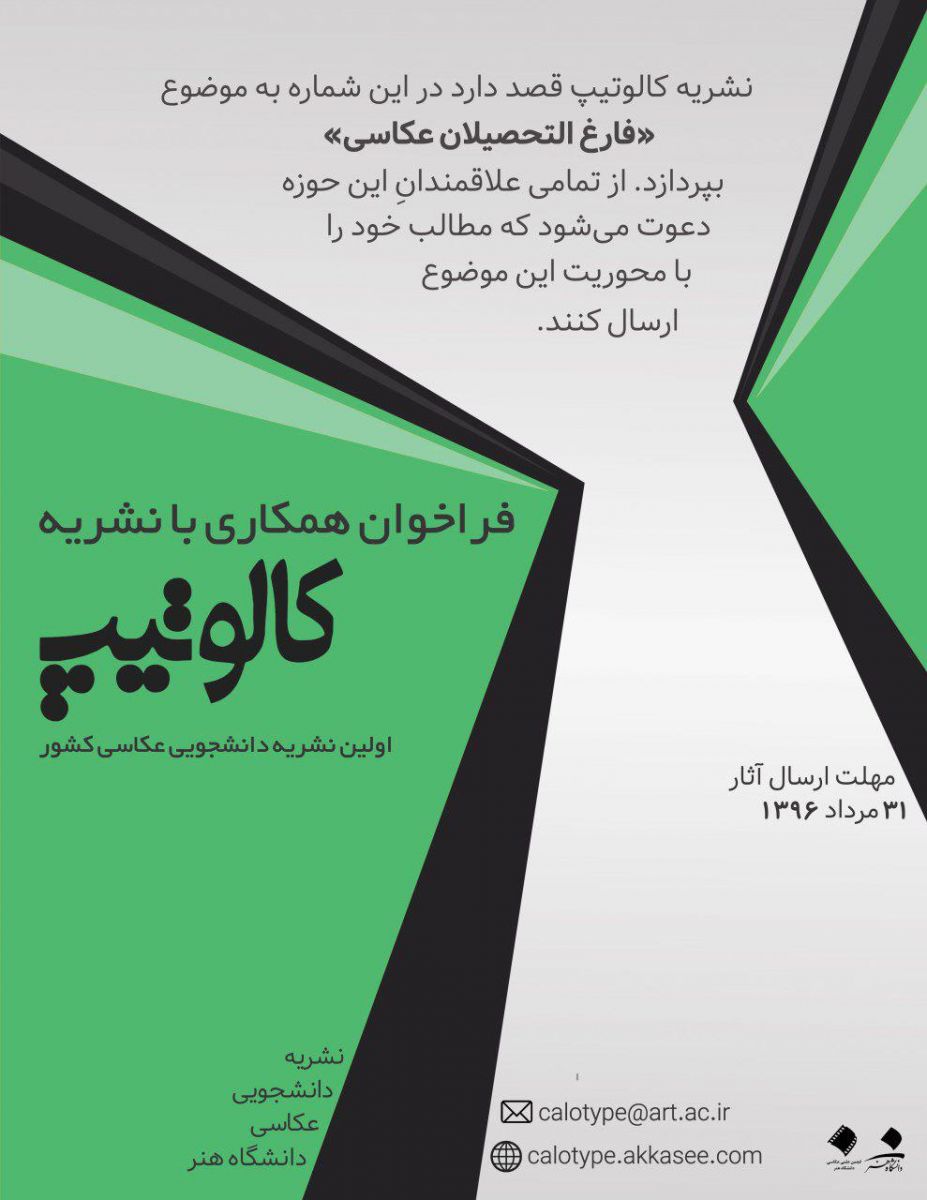 فراخوان همکاری با نشریه کالوتیپ ۲۶ تیر ۱۳۹۶ | ۱۷:۰۳ کد : ۱۱۲۳ رویدادها ارسال به دیگران نام شما ایمیل شما ایمیل دریافتکننده ارسال انصراف تعداد بازدید:۱۵۲۸