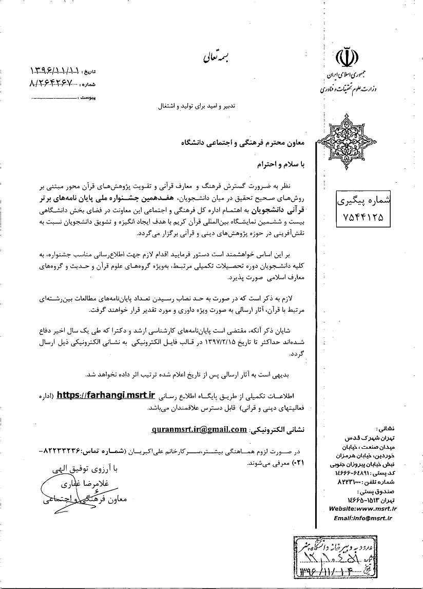 هفدهمین جشنوارۀ ملی پایان نامه های برتر قرآنی دانشجویان ۱۷ بهمن ۱۳۹۶ | ۰۸:۳۷ کد : ۱۵۱۷ ارسال به دیگران نام شما ایمیل شما ایمیل دریافتکننده ارسال انصراف تعداد بازدید:۱۰۷۵