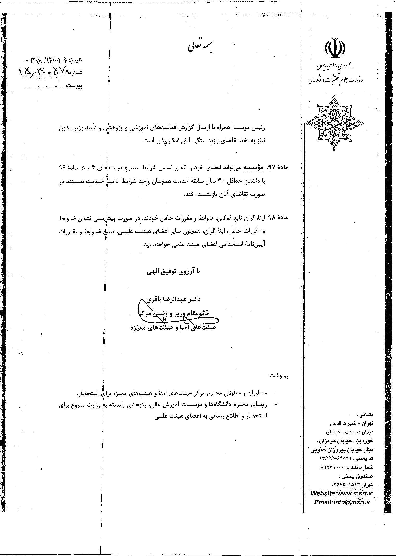بخشنامه اصلاحیه مواد ۹۶ ،۹۷ و ۹۸ آیین نامه استخدامی اعضای هیات علمی درباره بازنشستگی ۲۲ اسفند ۱۳۹۶ | ۰۸:۵۲ کد : ۱۶۱۷ ارسال به دیگران نام شما ایمیل شما ایمیل دریافتکننده ارسال انصراف تعداد بازدید:۲۱۷۷