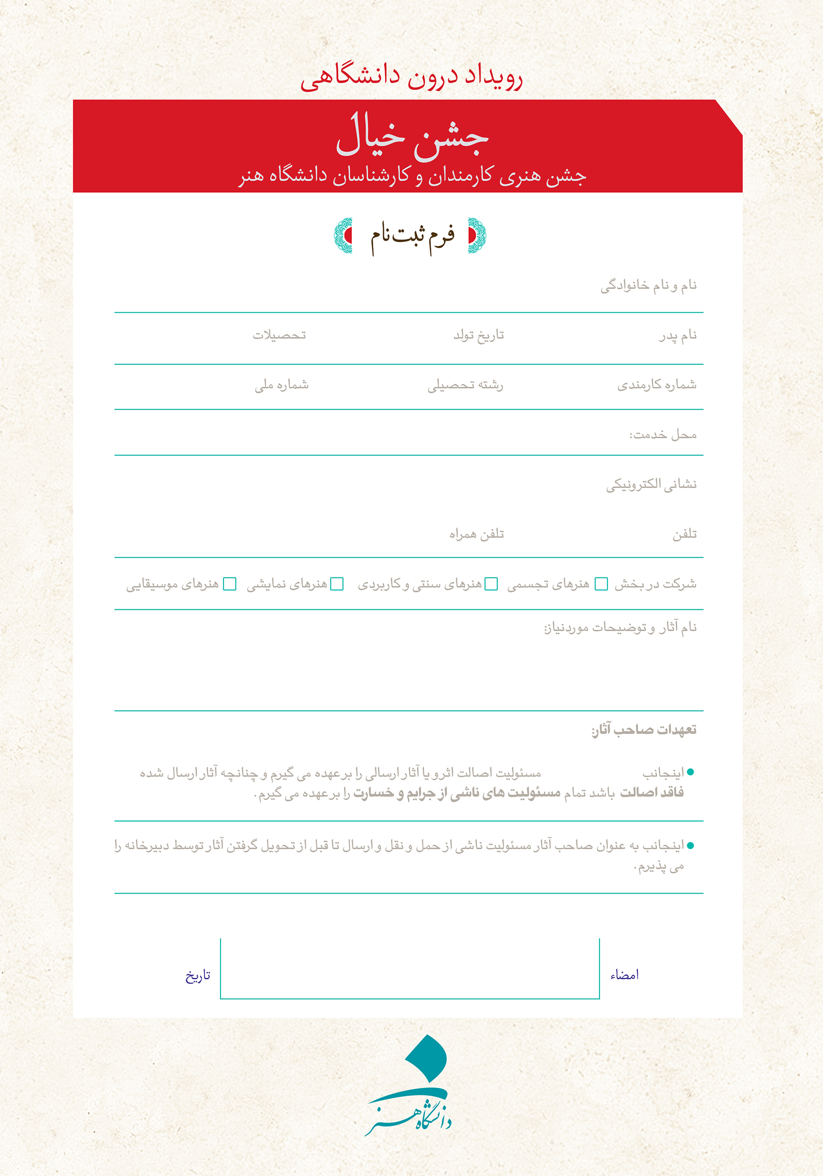 جشن خیال دومین جشنواره کارمندان هنرمند دانشگاه هنر (فراخوان ارسال اثر) ۲۳ اسفند ۱۳۹۶ | ۱۴:۴۵ کد : ۱۶۲۲ رویدادها ارسال به دیگران نام شما ایمیل شما ایمیل دریافتکننده ارسال انصراف تعداد بازدید:۲۵۳۰ دریافت فایل