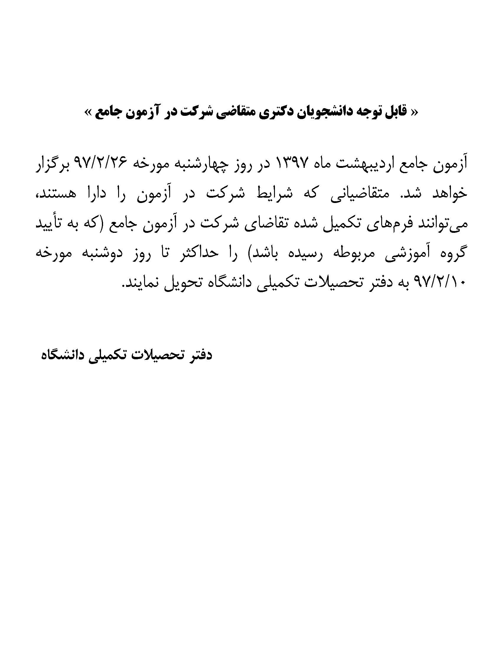 قابل توجه دانشجویان دکتری متقاضی شرکت در آزمون جامع ۲۲ فروردین ۱۳۹۷ | ۰۸:۱۶ کد : ۱۶۳۸ ارسال به دیگران نام شما ایمیل شما ایمیل دریافتکننده ارسال انصراف تعداد بازدید:۱۱۴۶