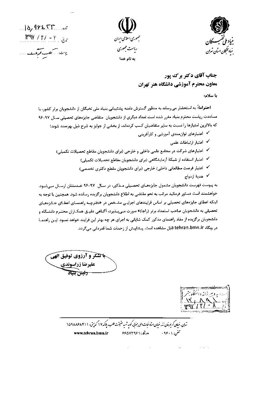 فهرست اسامی دانشجویان مشمول بخشی از جایزه های تحصیلی بنیاد ملی نخبگان سال ۹۷-۹۶ ۱۵ اردیبهشت ۱۳۹۷ | ۰۹:۳۴ کد : ۱۷۰۸ ارسال به دیگران نام شما ایمیل شما ایمیل دریافتکننده ارسال انصراف تعداد بازدید:۱۵۰۲