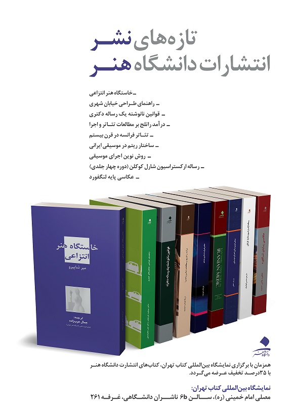 دانشگاه هنر با 6 عنوان کتاب جدید و 3 عنوان کتاب تجدید چاپ شده و در مجموع با 60 عنوان کتاب در نمایشگاه کتاب امسال حضور دارد. در این نمایشگاه کتاب های طراحی خیابان شهری ترجمه دکتر امیر شکیبامنش، کتاب خاستگاه هنر انتزاعی ترجمه دکتر جمال عرب زاده، کتاب قوانین نانوشته یک رساله دکترا ترجمه دکتر مصطفی کیانی، درآمد راتلج بر مطالعات تئاتر و اجرا ترجمه دکتر شیرین بزرگمهر، تئاتر فرانسه در قرن بیستم ترجمه ترجمه روح الله قاسمی (چاپ مشترک دانشگاه هنر با دانشگاه شهید بهشتی)، ساختار ریستم در موسیقی ایرانی تالیف دکتر محمد رضا آزاده فر (چاپ سوم با ویراست جدید)، روش نوین اجرای موسیقی (چاپ هفتم)، رساله ارکستراسیون (چاپ سوم) که در سال 1396 منتشر شده، عرضه شده است. نمایندگی فروش کتاب ها در نمایشگاه امسال، انتشارت مرکب سفید است.
