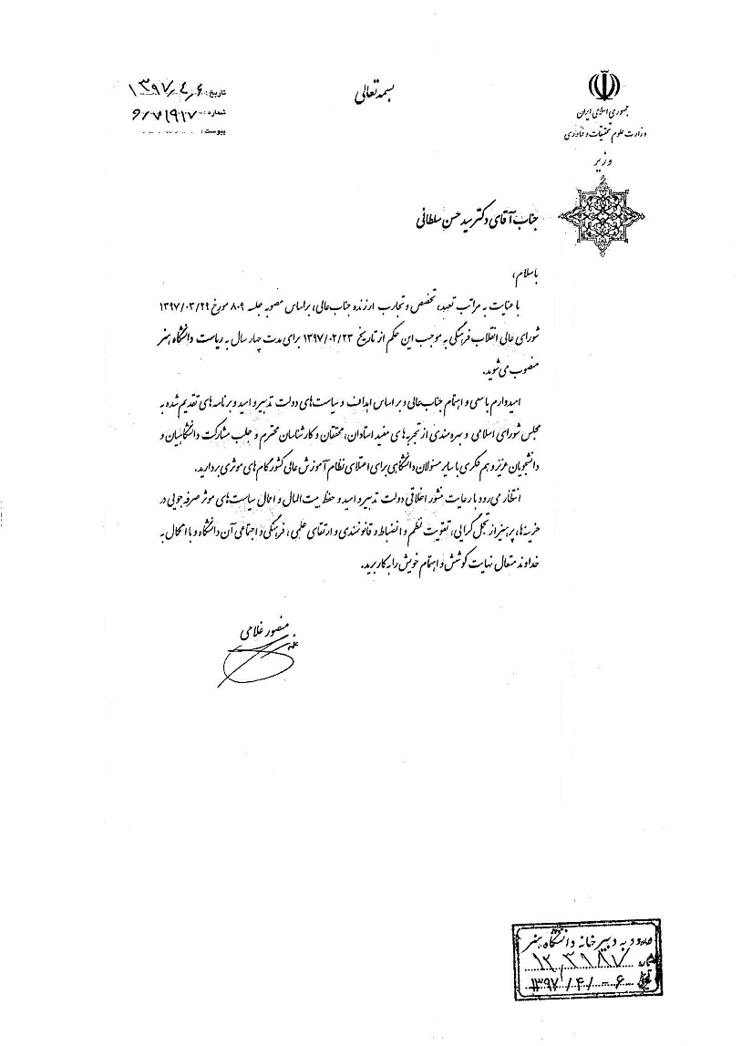 دکتر سید حسن سلطانی به مدت چهار سال به عنوان رییس دانشگاه هنر منصوب شد ۰۶ تیر ۱۳۹۷ | ۱۷:۲۴ کد : ۱۸۰۲ رویدادها ارسال به دیگران نام شما ایمیل شما ایمیل دریافتکننده ارسال انصراف تعداد بازدید:۲۹۵۶