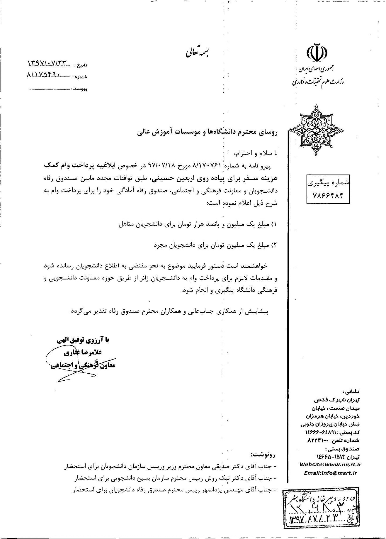 اطلاعیه پرداخت وام کمک هزینه سفر برای پیاده روی اربعین حسینی ( ویژه دانشجویان) ۲۵ مهر ۱۳۹۷ | ۰۹:۲۰ کد : ۱۹۷۶ ارسال به دیگران نام شما ایمیل شما ایمیل دریافتکننده ارسال انصراف تعداد بازدید:۱۴۹۰