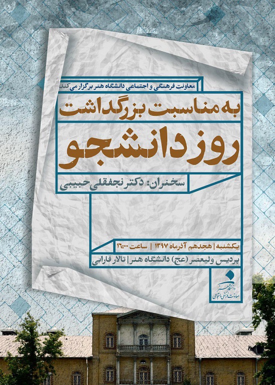 به اطلاع کلیه دانشجویان گرامی می رساند به مناسبت روز دانشجو مراسمی در روز یکشنبه مورخ 97/9/18 ساعت 16 در تالار فارابی واقع در پردیس ولیعصر(عج) با سخنرانی دکتر نجفقلی حبیبی ( عضو هیات علمی دانشگاه تهران و رئیس سابق دانشگاه علامه طباطبایی ) برگزار خواهد شد، از علاقه مندان جهت شرکت در این مراسم دعوت به عمل می آید .