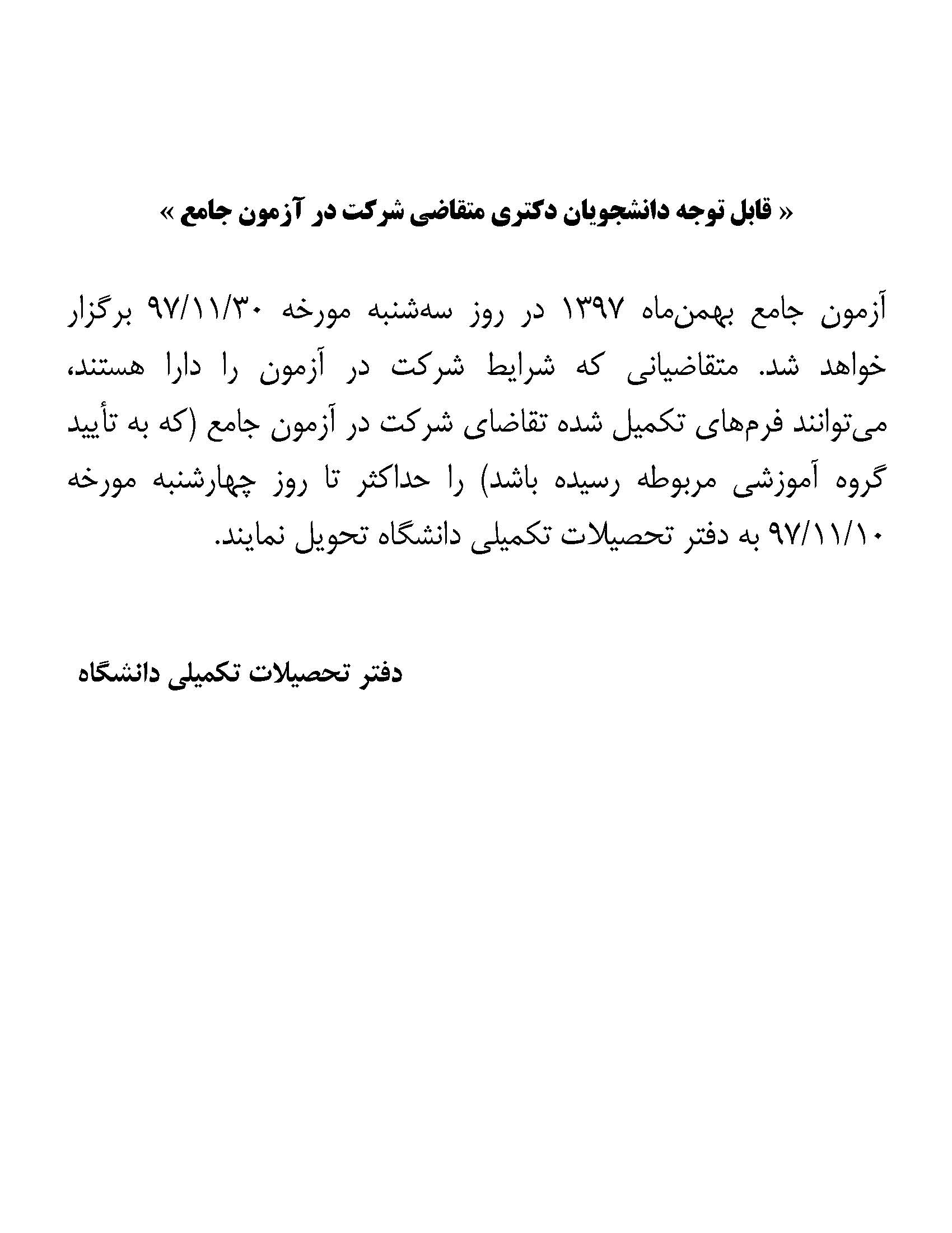 قابل توجه دانشجویان دکتری متقاضی شرکت در آزمون جامع ۰۵ دی ۱۳۹۷ | ۱۵:۴۱ کد : ۲۱۵۳ ارسال به دیگران نام شما ایمیل شما ایمیل دریافتکننده ارسال انصراف تعداد بازدید:۱۱۱۳