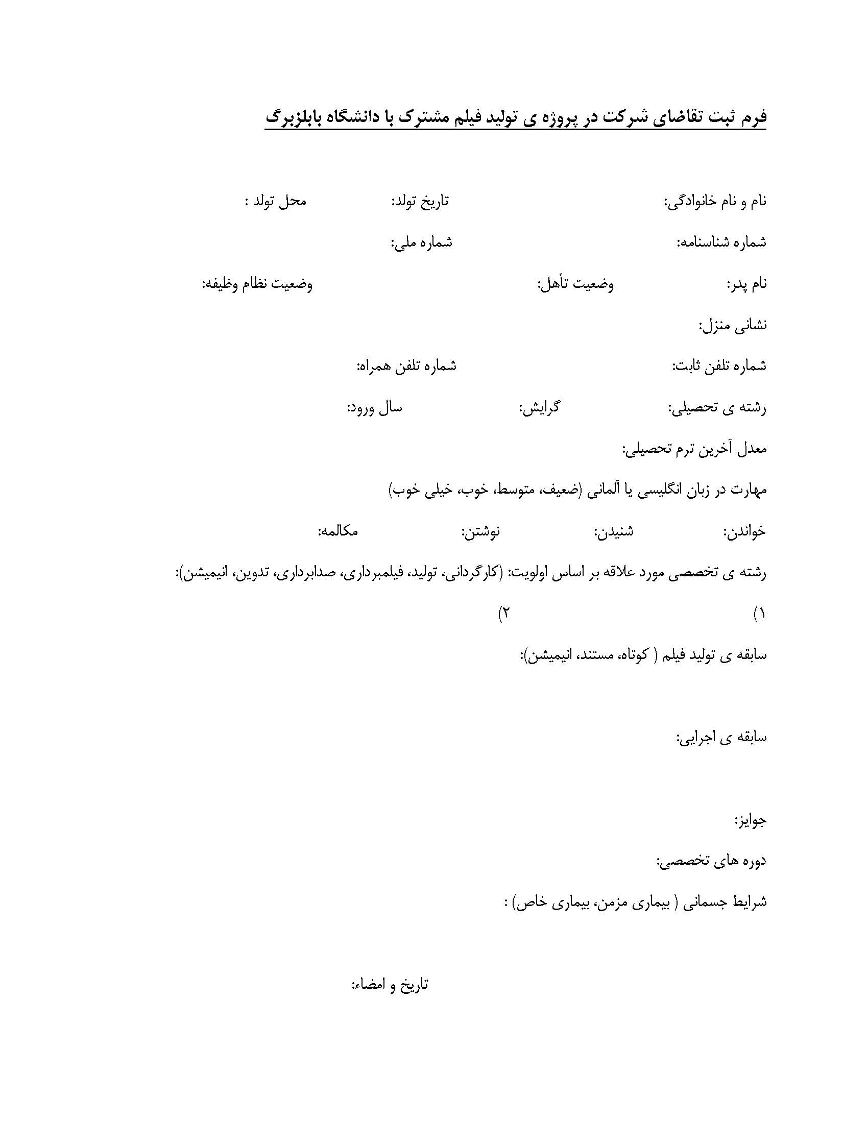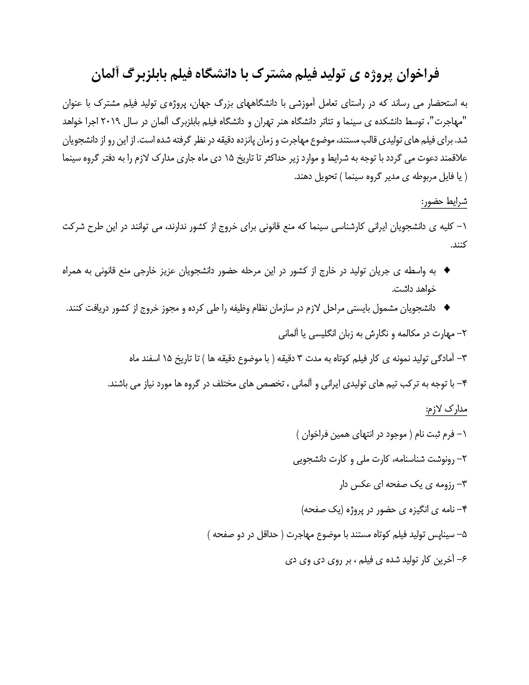 فراخوان پروژه تولید فیلم مشترک با دانشگاه فیلم بابلزبرگ آلمان ۱۰ دی ۱۳۹۷ | ۰۹:۴۹ کد : ۲۱۶۳ ارسال به دیگران نام شما ایمیل شما ایمیل دریافتکننده ارسال انصراف تعداد بازدید:۱۸۹۹ دریافت فرم ثبت نام