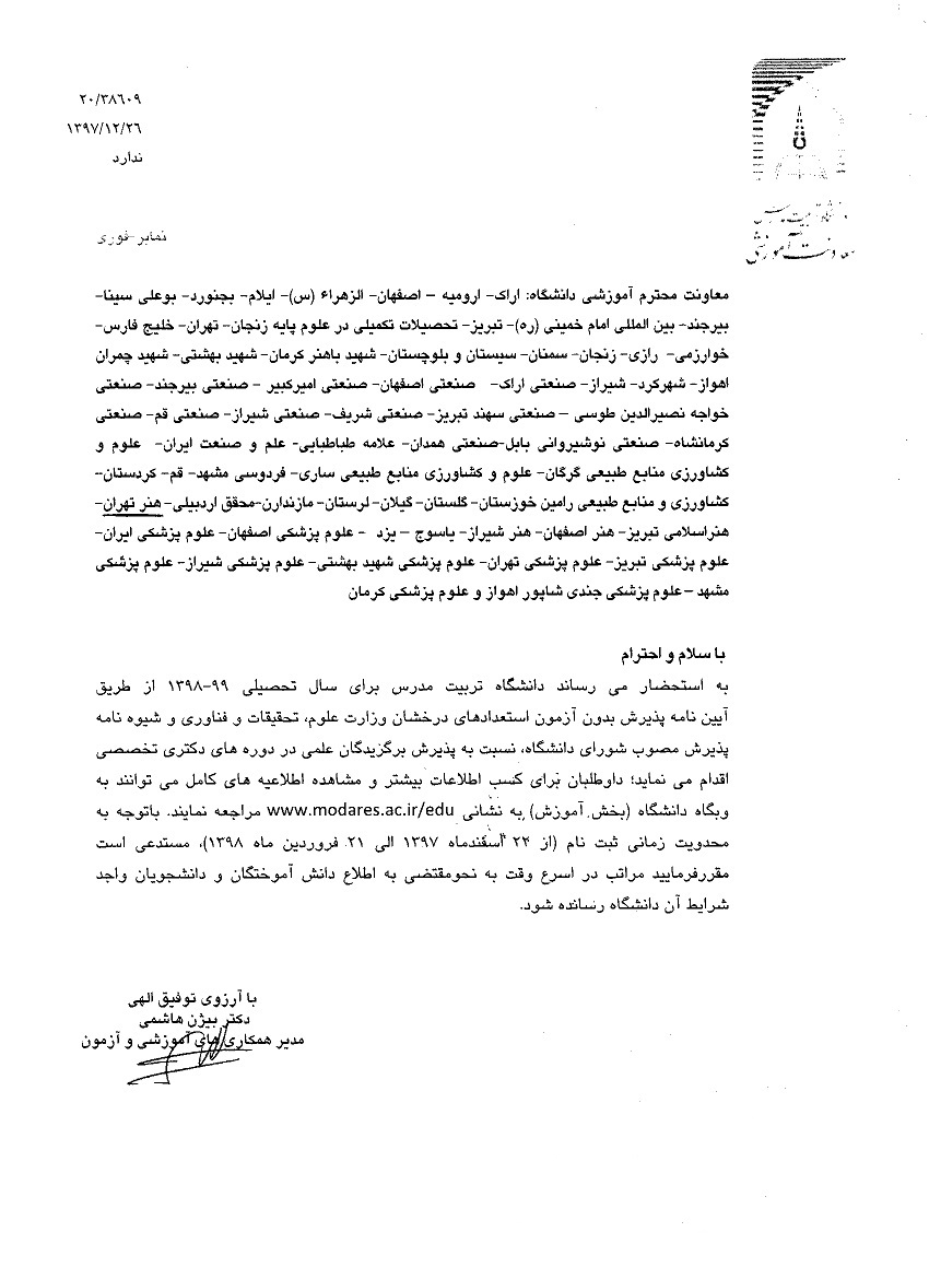 پذیرش برگزیدگان علمی دوره های دکتری تخصصی بدون آزمون استعداد درخشان دانشگاه تربیت مدرس ۲۶ اسفند ۱۳۹۷ | ۱۴:۴۳ کد : ۲۳۹۵ ارسال به دیگران نام شما ایمیل شما ایمیل دریافتکننده ارسال انصراف تعداد بازدید:۱۸۳۹