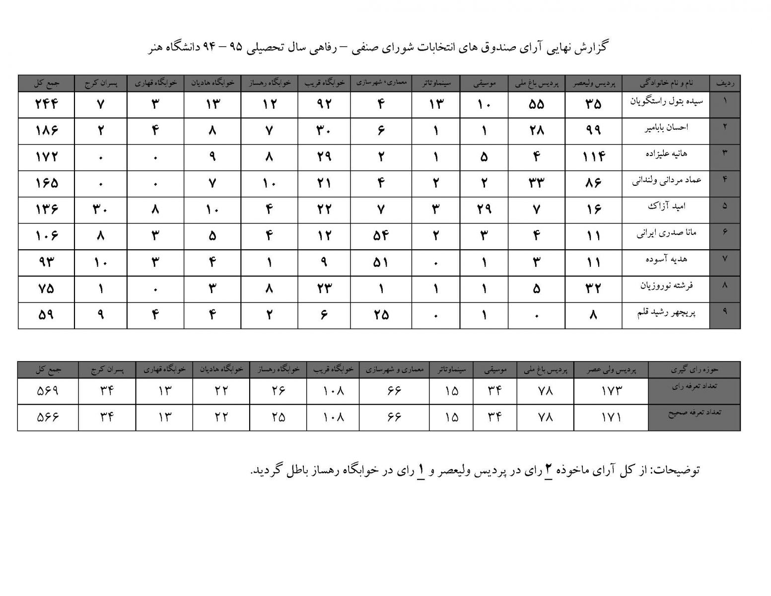 مطابق تقویم زمانبندی اعلام شده در آذر ۹۴ در خصوص برگزاری انتخابات شورای صنفی – رفاهی دانشجویان در سال تحصیلی ۹۵ - ۹۴ بدینوسیله به اطلاع می رساند انتخابات شورای صنفی - رفاهی دانشجویان دانشگاه هنر در تاریخ ۹۴/۱۰/۱۲ در پردیس های دانشگاه و خوابگاه های دانشجویی از ساعت ۹ الی ۱۷ با استناد به آیین نامه مربوطه به نحو مطلوب برگزار گردید که نتایج آن به شرح زیر اعلام می گردد: