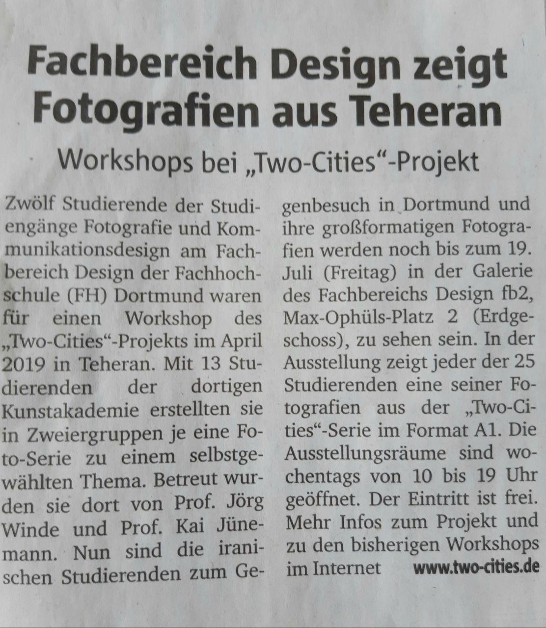 روز پنجشنبه خبر برگزاری نمایشگاه عکسهای کارگاه مشترک تهران در دانشکدهی طراحی و توضیح مختصر دربارهی فعالیت کارگاه در یکی از روزنامههای شهر دورتموند چاپ شد.