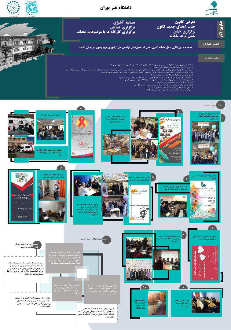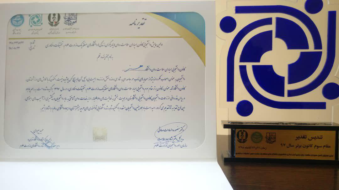گفتنی است که کانون همیاران سلامت روان که از سال 1395 در دانشگاه هنر به سرپرستی مرکز بهداشت درمان و مشاوره شکل گرفته، توانسته است که در سه دوره پیاپی در سالهای 1395 الی 1398 مقامهای کانون برتر کشوری و منطقهای را کسب نماید.