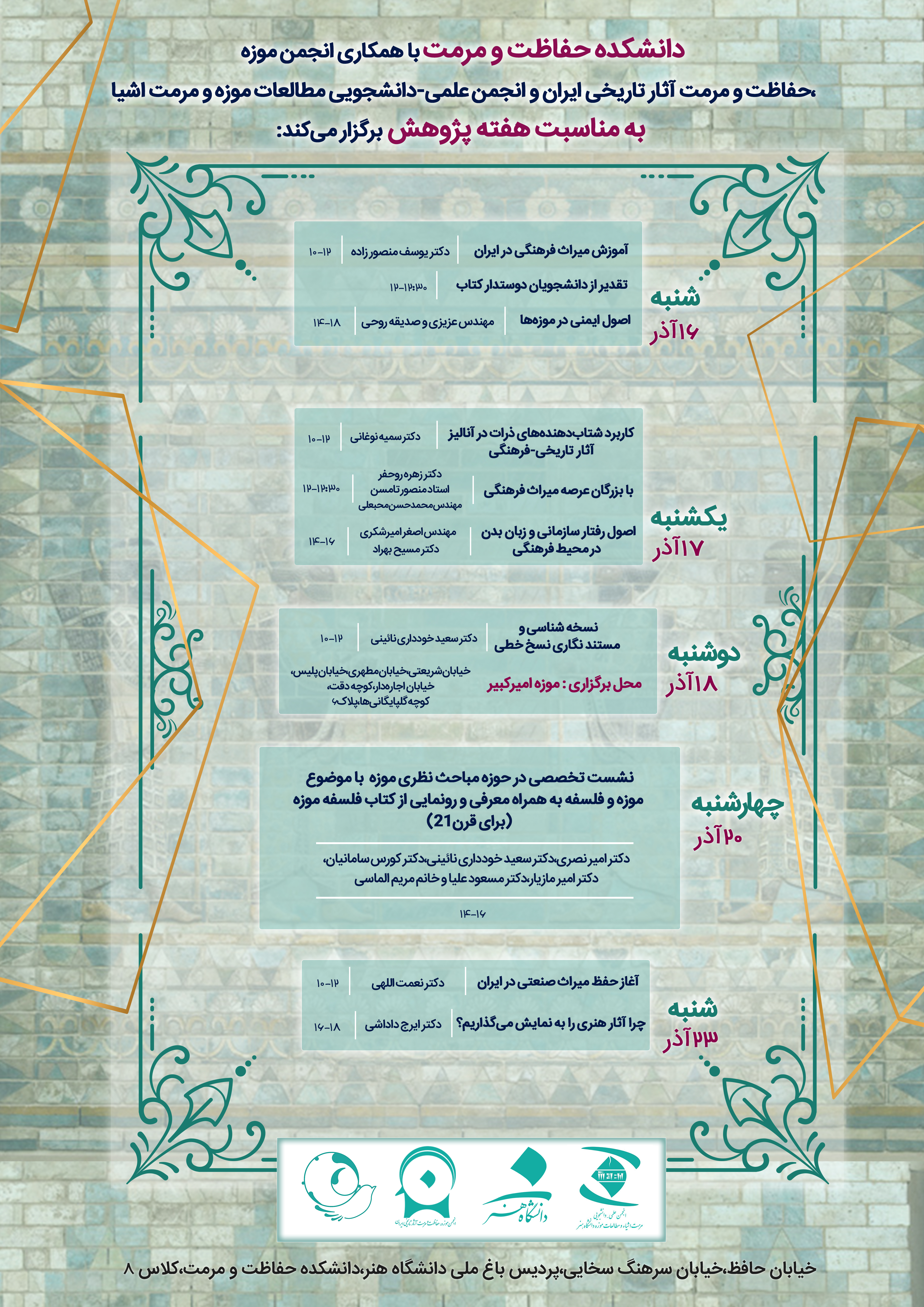 برنامه های دانشکده حفاظت و مرمت و انجمن موزه، حفاظت ومرمت آثار تاریخی ایران هفته پژوهش- آذر ۱۳۹۸ ۱۳ آذر ۱۳۹۸ | ۰۹:۵۰ کد : ۳۰۸۸ ارسال به دیگران نام شما ایمیل شما ایمیل دریافتکننده ارسال انصراف تعداد بازدید:۱۴۱۸ برنامه های دانشکده حفاظت و مرمت و انجمن موزه، حفاظت ومرمت آثار تاریخی ایران هفته پژوهش- آذر 1398