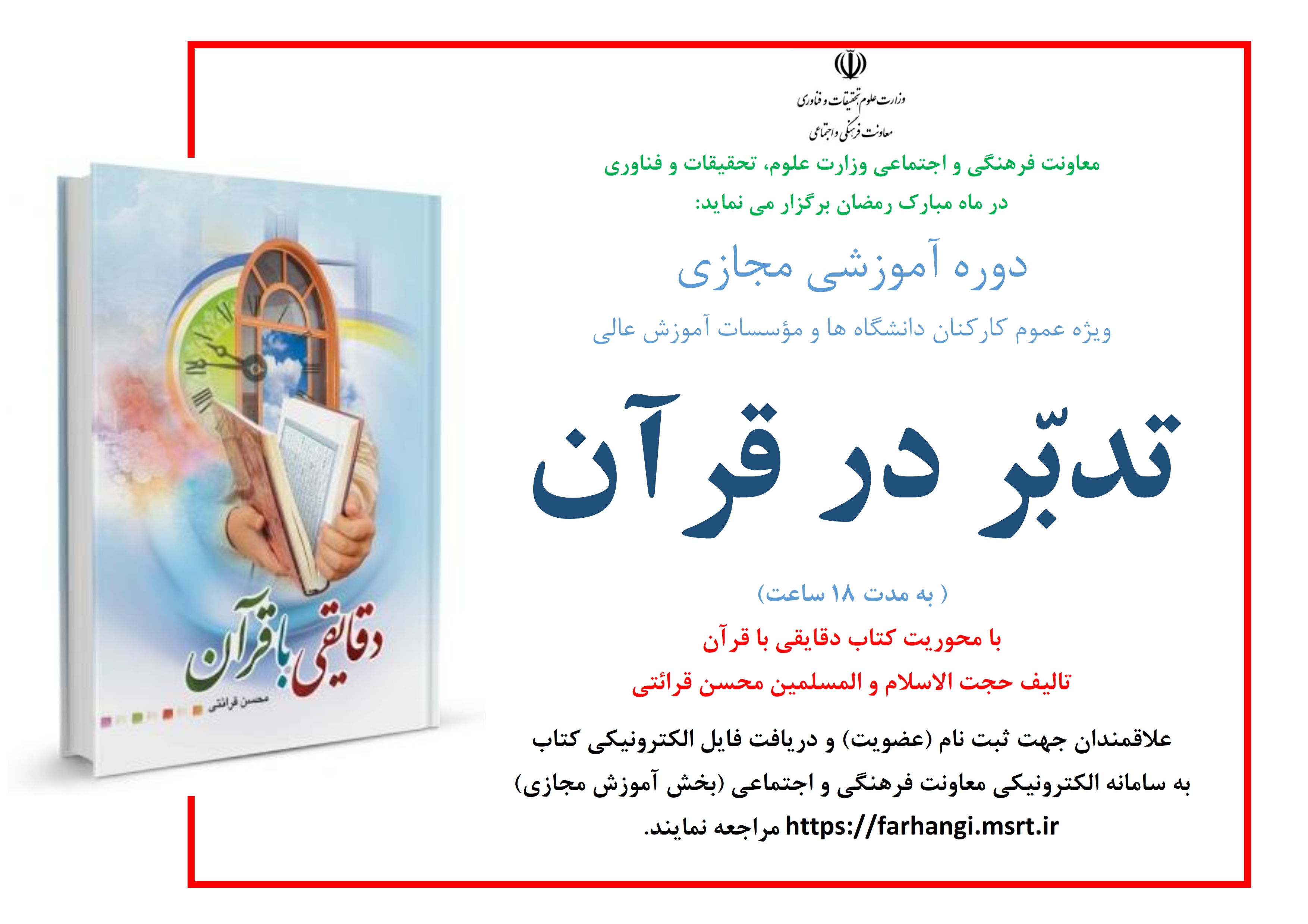 معاونت فرهنگی و اجتماعی وزارت علوم، تحقیقات و فناوری در نظر دارد در ماه مبارک رمضان دوره آموزشی مجازی تدبر در قرآن را با محوریت کتاب "دقایقی با قرآن" تألیف حجت الاسلام و المسلمین محسن قرائتی به مدت 18 ساعت برای عموم کارکنان دانشگاهها و موسسات آموزش عالی برگزار نماید. علاقه مندان می توانند برای شرکت در این دوره به سامانه الکترونیکی معاونت فرهنگی و اجتماعی (بخش آموزش مجازی) مراجعه نموده و پس از ثبت نام و عضویت، راهنمای شرکت در دوره و فایل الکترونیک کتاب را دریافت کنند.