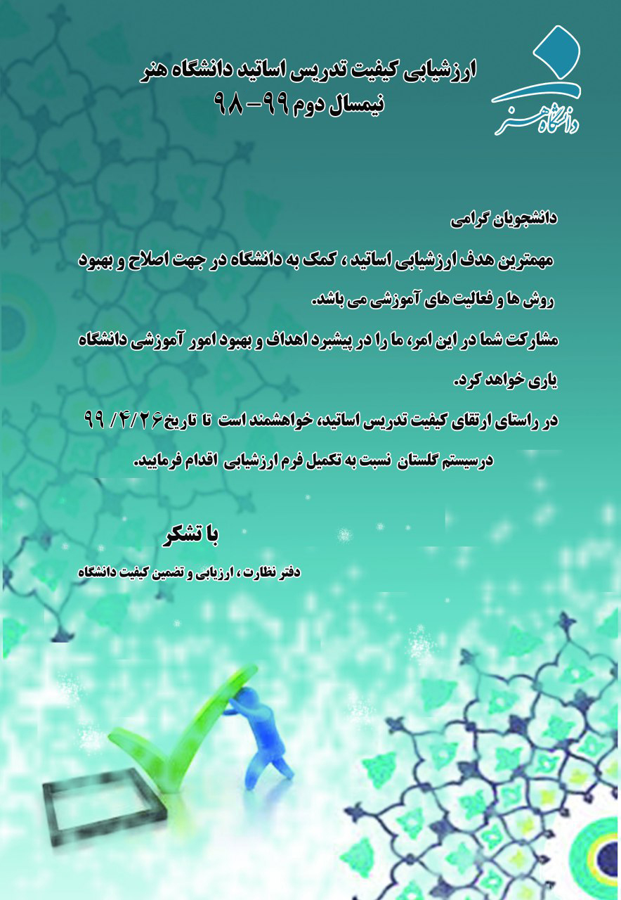 ارزشیابی کیفیت تدریس اساتید دانشگاه هنر نیمسال ۹۹-۹۸ ۱۵ تیر ۱۳۹۹ | ۱۱:۲۴ کد : ۳۶۲۳ ارسال به دیگران نام شما ایمیل شما ایمیل دریافتکننده ارسال انصراف تعداد بازدید:۱۱۲۹