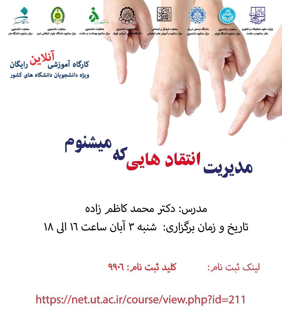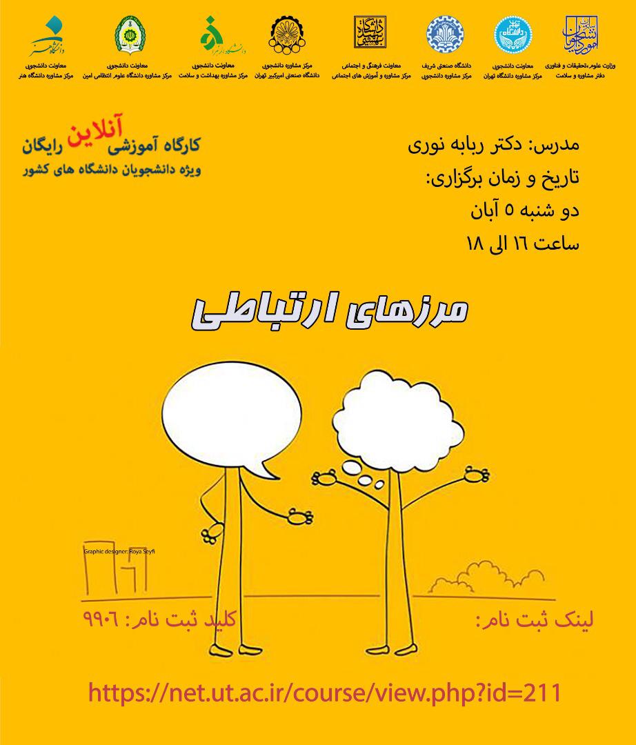 کارگاههای آموزشی آنلاین با هدف توانمند سازی آحاد جامعه دانشگاهی برگزار می شود. باتوجه به شرایط روان شناختی حاکم بر جامعه و نقش بی بدیل مراکز مشاوره دانشگاهی در زمینه ارائه خدمات بهداشت روان به افراد دراین شرایط و نیازی که هم اکنون بیش از گذشته به واسطه پاندمی کرونا در جامعه احساس می شود ،ارتقاءسلامت روان افراد در محیط های دانشگاهی بعنوان مسئولیت اجتماعی مراکز مشاوره در دستور کار قرارگرفت .این دوره های آموزشی رایگان و بصورت وبینار برنامه ریزی و اجرا می شود. علاقمندان می توانند از طریق آدرس: