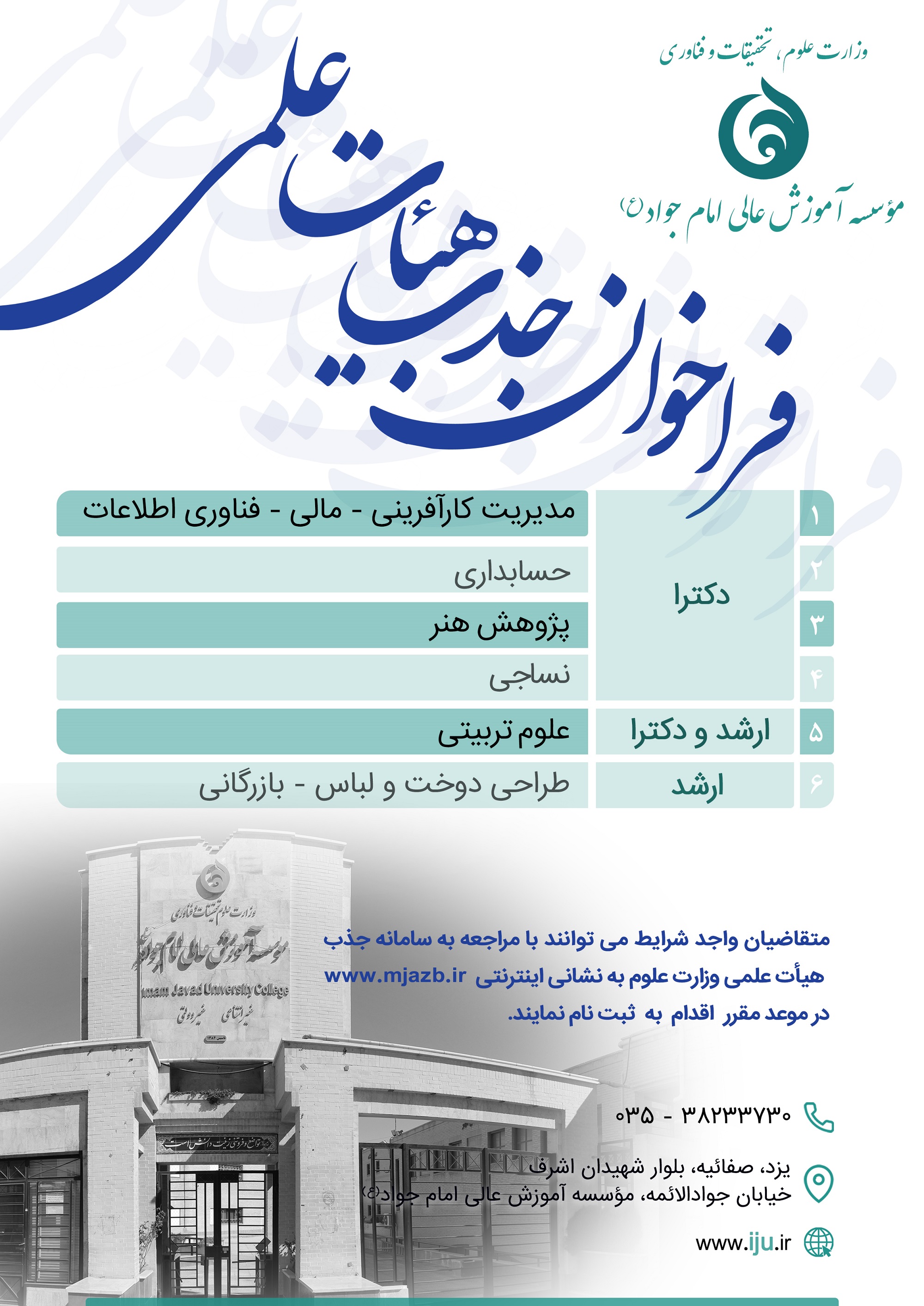 فراخوان جذب هیات علمی در مقاطع دکترا و کارشناسی ارشد سال ۱۳۹۹ ۰۲ آذر ۱۳۹۹ | ۱۸:۲۸ کد : ۳۸۹۳ رویدادها ارسال به دیگران نام شما ایمیل شما ایمیل دریافتکننده ارسال انصراف تعداد بازدید:۱۰۴۸