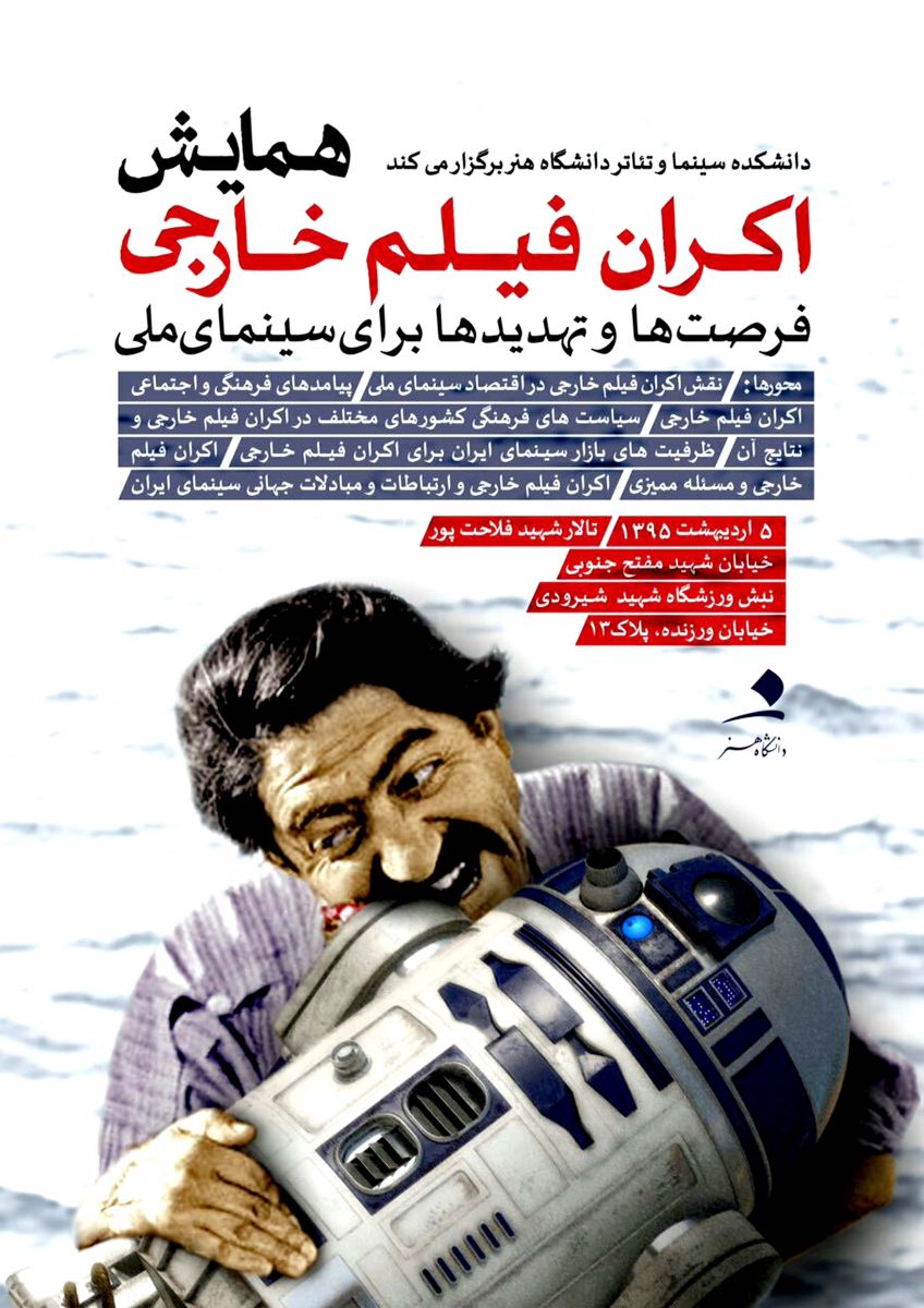 همزمان با برگزاری جشنواره جهانی فیلم فجر، همایش «اکران فیلم خارجی: فرصت ها و تهدید ها برای سینمای ملی» روز یکشنبه ٥ اردیبهشت ١٣٩٥ در دانشکده سینما و تئاتر دانشگاه هنر برگزار خواهد شد.
