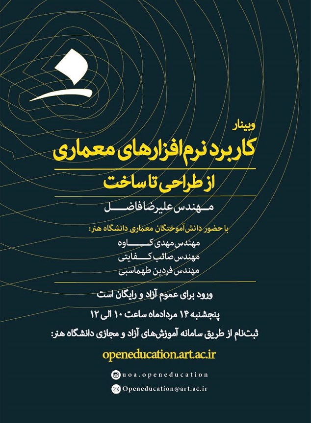 وبینار کاربرد نرمافزارهای معماری، از طراحی تا ساخت با حضور دانشآموختگان معماری دانشگاه هنر در رشتههای معماری، معماری داخلی، معماریانرژی صبح روز پنجشنبه ۱۴ مرداد ۱۴۰۰ ساعت ۱۰ الی ۱۲ در سامانه آموزش مجازی دانشگاه هنر برگزار میشود. شرکت در این وبینار رایگان است.
