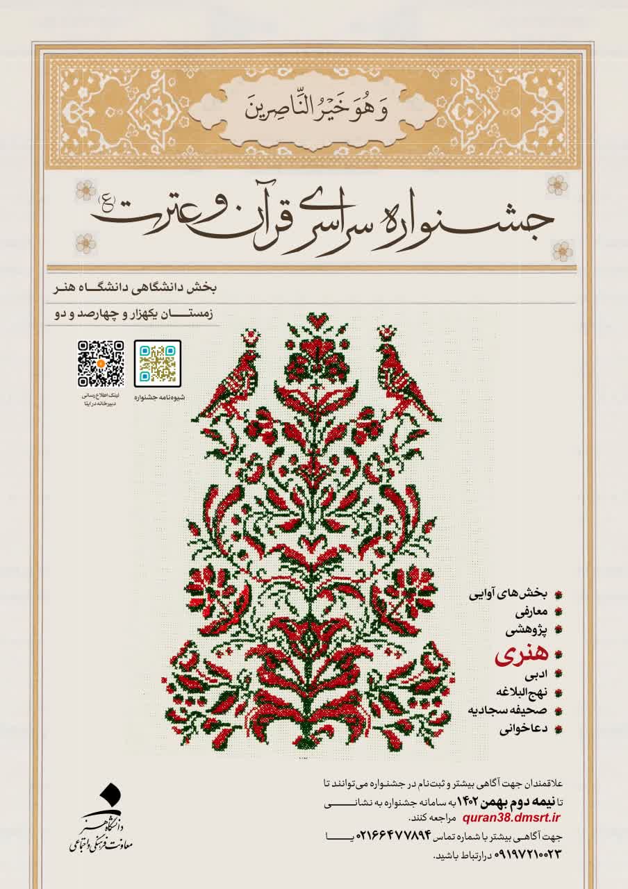 ارتباط با کارشناس دبیرخانه قرآن و عترت دانشگاه هنر 02166477894 - 09197210023