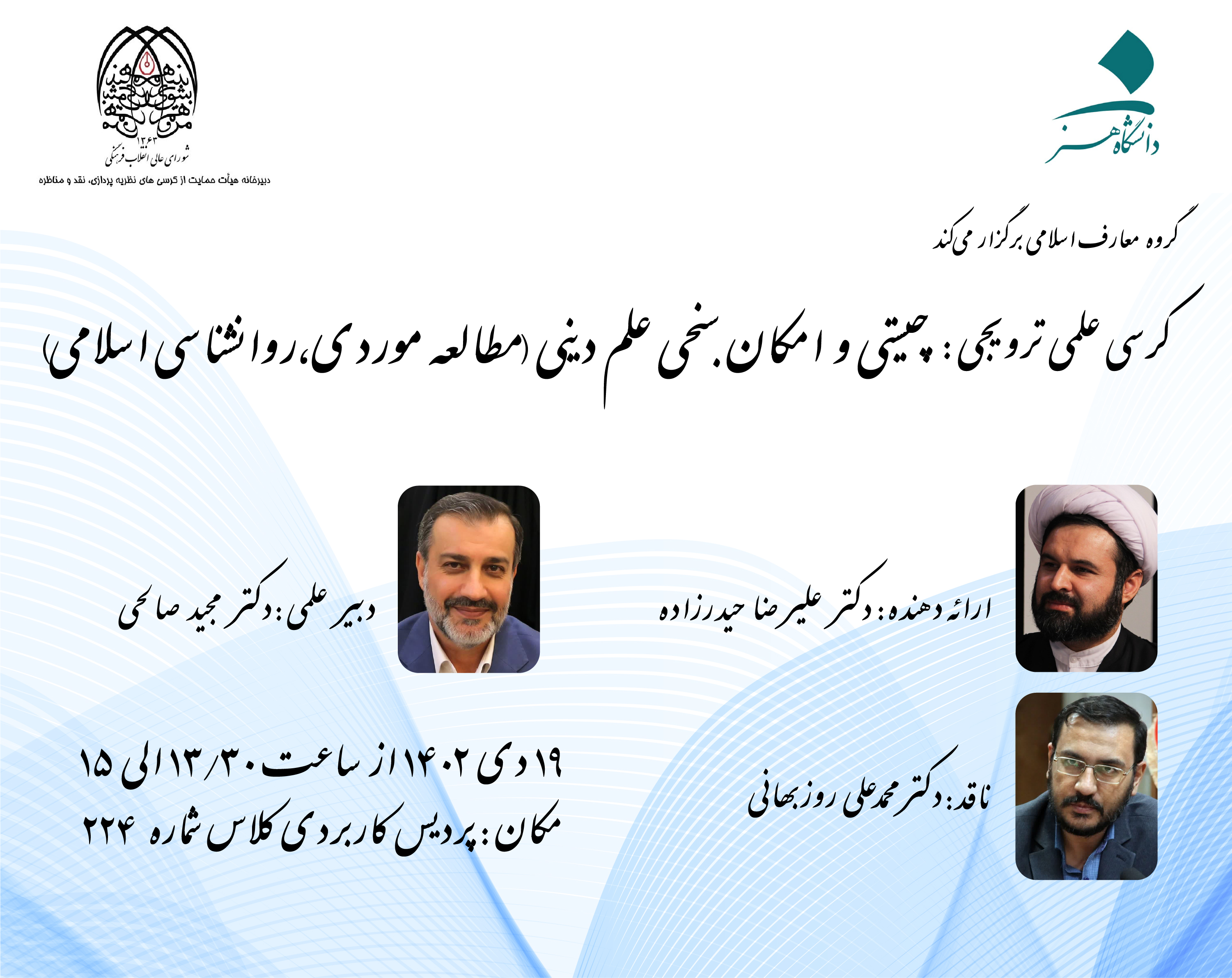 کرسی علمی ترویجی با موضوع: چیستی و امکان سنجی علم دینی (مطالعه موردی، روانشناسی اسلامی) ۱۶ دی ۱۴۰۲ | ۱۳:۴۹ کد : ۵۹۷۸ رویدادها ارسال به دیگران نام شما ایمیل شما ایمیل دریافتکننده ارسال انصراف تعداد بازدید:۲۲۹