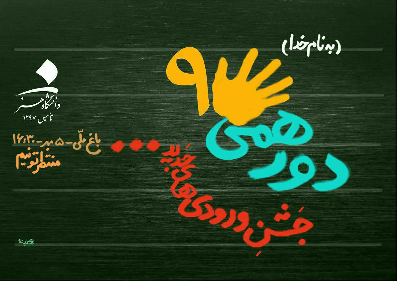 معاونت فرهنگی و اجتماعی از تمامی اعضای هیأت علمی، همکاران بخش اداری و دانشجویان دانشگاه هنر و خانواده محترم ایشان جهت حضور در جشن ورودی ۹۵ (دور همی نود و پنجی ها) واقع در مجموعه تاریخی- فرهنگی باغ ملی (دانشگاه هنر) در تاریخ ۵ مهر ۹۵ ساعت ۱۶:۳۰ الی ۱۹ دعوت بعمل می آورد.