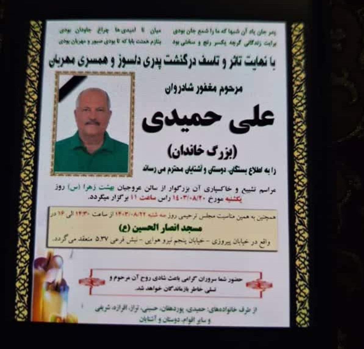 یادآور می شود مراسم تشییع و خاکسپاری، روز یکشنبه 20 آبان ماه ساعت 11 از سالن عروجیان بهشت زهرا برگزار می شود. همچنین مجلس یادبودی روز سه شنبه 22 آبان ماه از ساعت 14:30 الی 16 در مسجد انصار الحسین (ع) واقع در پیروزی، خیابان پنجم نیرو هوایی،نبش فرعی 537 برگزار می گردد.
