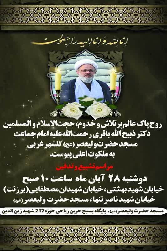اطلاعیه ی مراسم تشییع پیکر شادروان حجت الاسلام و المسلمین ذبیح اله باقری