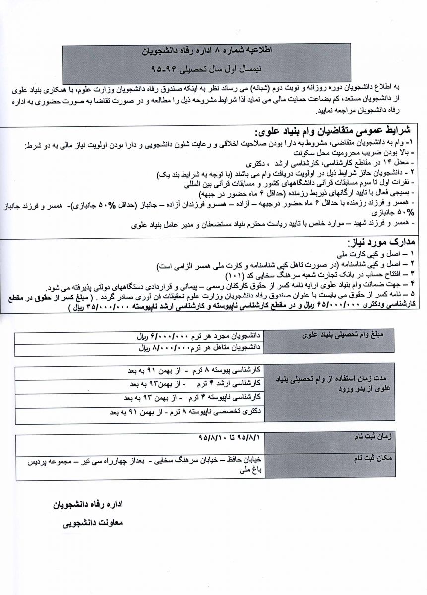 اطلاعیه شماره ۸ اداره رفاه دانشجویان(وام بنیاد علوی) ۰۳ آبان ۱۳۹۵ | ۱۴:۴۴ کد : ۶۵۹ ارسال به دیگران نام شما ایمیل شما ایمیل دریافتکننده ارسال انصراف تعداد بازدید:۱۱۹۷