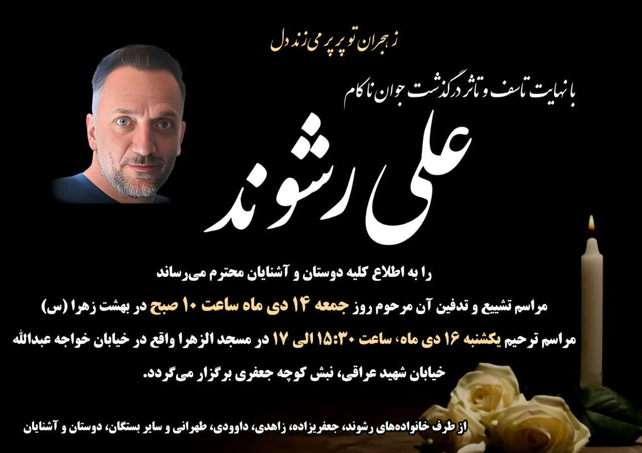 با نهایت تاسف و تالم مطلع شدیم، علی رشوند فرزند عزیز سرکار خانم جعفریزاده از همکاران بازنشسته دانشگاه، دار فانی را وداع گفته و به دیار حق شتافته است.