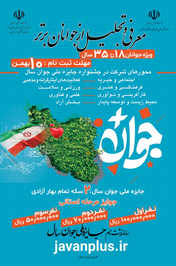 به اطلاع میرساند به مناسبت گرامیداشت هفته جوان و ولادت با سعادت حضرت علی اکبر(ع) ، جشنواره استانی انتخاب جوان سال با عنوان جایزه ملی جوان سال و در دو سطح استانی و ملی با هدف " ایجاد فرصت برابر برای مشارکت جوانان کشور از طریق فراخوان عمومی " برگزار می گردد. جهت کسب اطلاعات بیشتر به نشانی:javanplus.ir مراجعه نمایید.