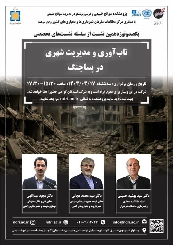 یکصدونوزدهمین نشست از سلسله نشستهای تخصصی توسط پژوهشکده سوانح طبیعی و کرسی یونسکو در مدیریت سوانح طبیعی با همکاری مرکز مطالعات سازمان شهرداریها و دهیاریهای کشور برگزار میگردد.