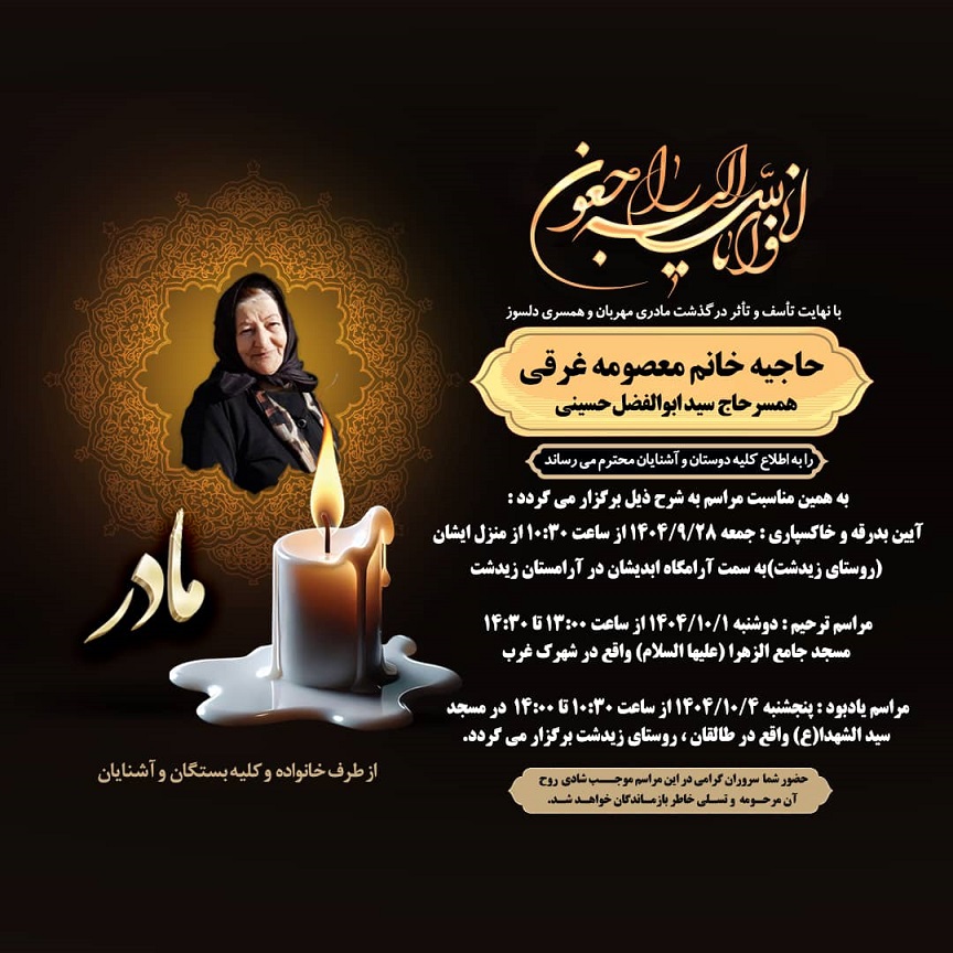 با نهایت تأثر و تأسف، مطلع شدیم، مادر گرامی آقای دکتر سیدبهشید حسینی رئیس محترم دانشگاه،دار فانی را وداع و به دیار باقی شتافتند. روابط عمومی دانشگاه، ضمن ابراز همدردی صمیمانه و عرض تسلیت از طرف کلیه ی همکاران و دانشجویان دانشگاه هنر ایران ،از درگاه خداوند متعال برای آن سفر کرده، آرامش و آمرزش و برای بازماندگان محترم بهویژه آقای دکتر حسینی، شکیبایی و بردباری خواستار است.