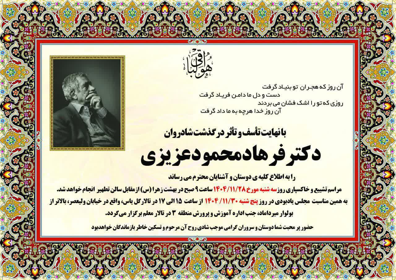 با نهایت تأثر و تأسف، مطلع شدیم، استاد گرانقدر دکتر فرهاد محمود عزیزی (همسر همکار گرانقدر سرکار خانم پروین طاعی)، از اساتید باتجربه ی گروه عکاسی دار فانی را وداع گفته و به دیار حق شتافتند. روابط عمومی دانشگاه، ضمن عرض تسلیت خدمت خانواده، همکاران و دانشجویان آن مرحوم و ابراز همدردی صمیمانه، از درگاه خداوند متعال برای آن سفر کرده ، آرامش و آمرزش و برای بازماندگان صبر و شکیبایی خواستار است.