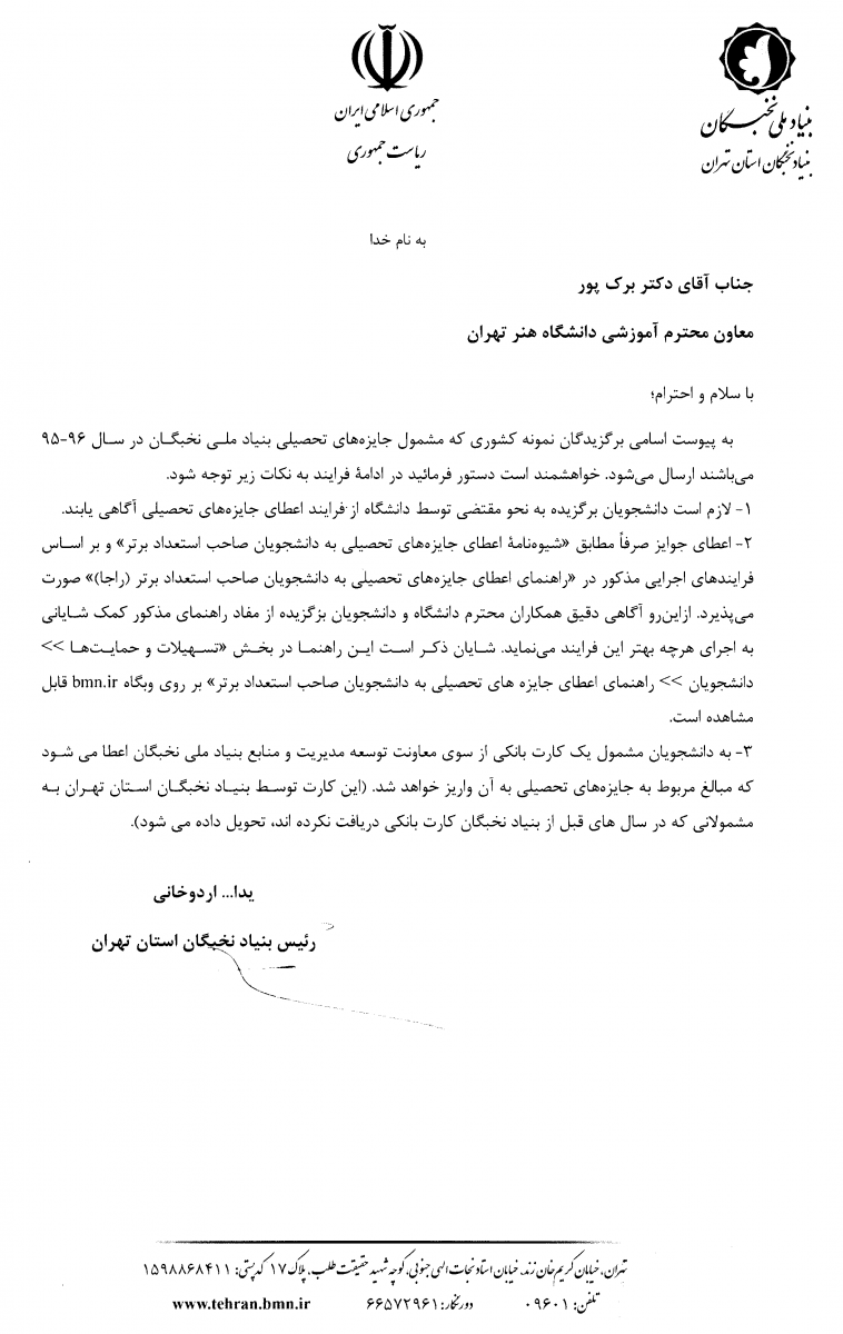 دانشجویان برگزیده نمونه کشوری مشمول جایزه های تحصیلی بنیاد ملی نخبگان سال تحصیلی۹۶-۹۵ ۰۵ دی ۱۳۹۵ | ۱۹:۳۳ کد : ۷۶۷ ارسال به دیگران نام شما ایمیل شما ایمیل دریافتکننده ارسال انصراف تعداد بازدید:۱۰۲۱