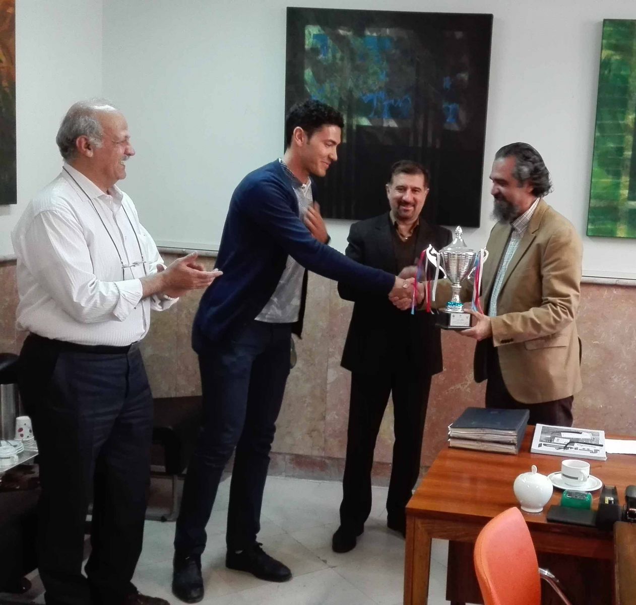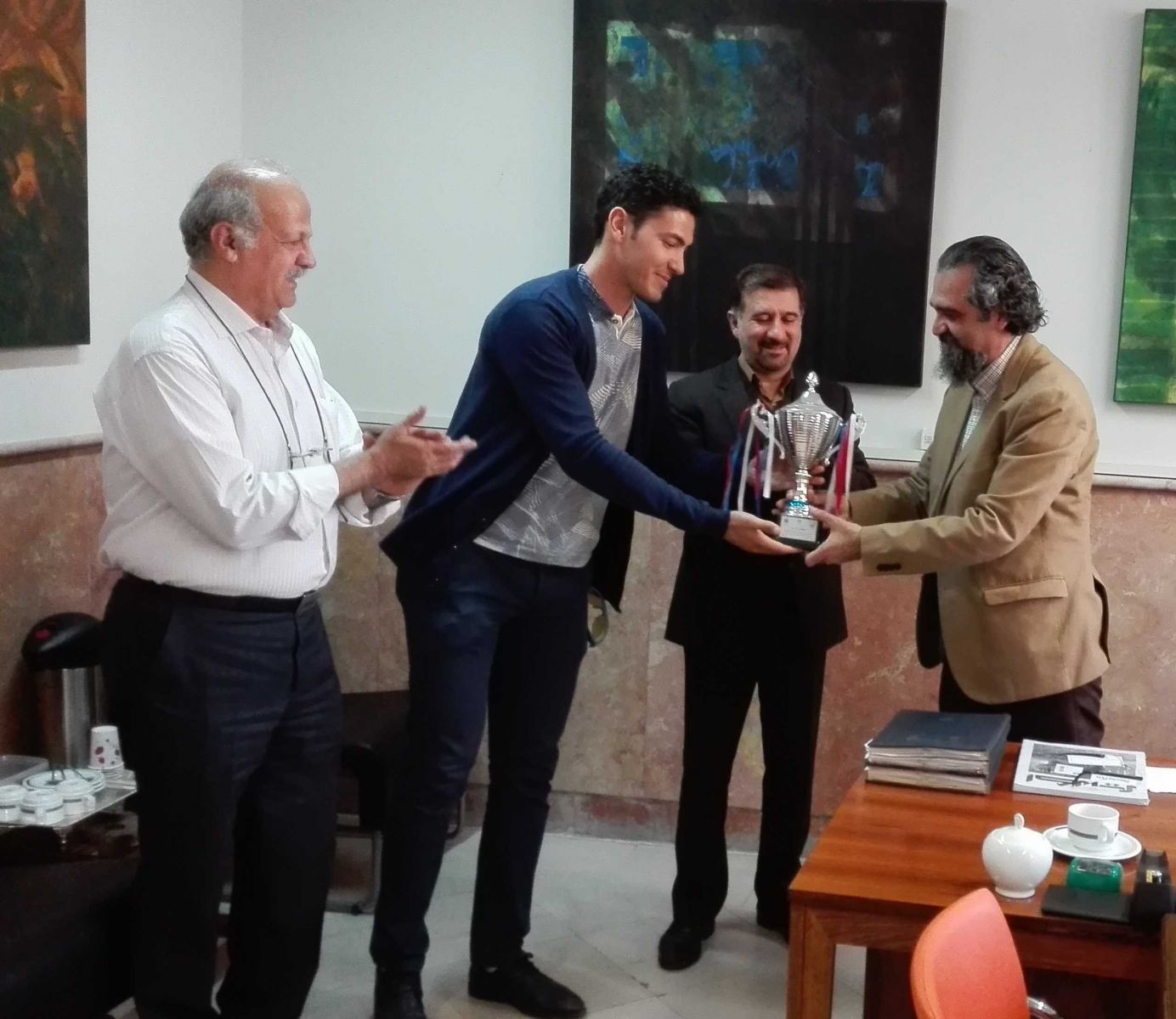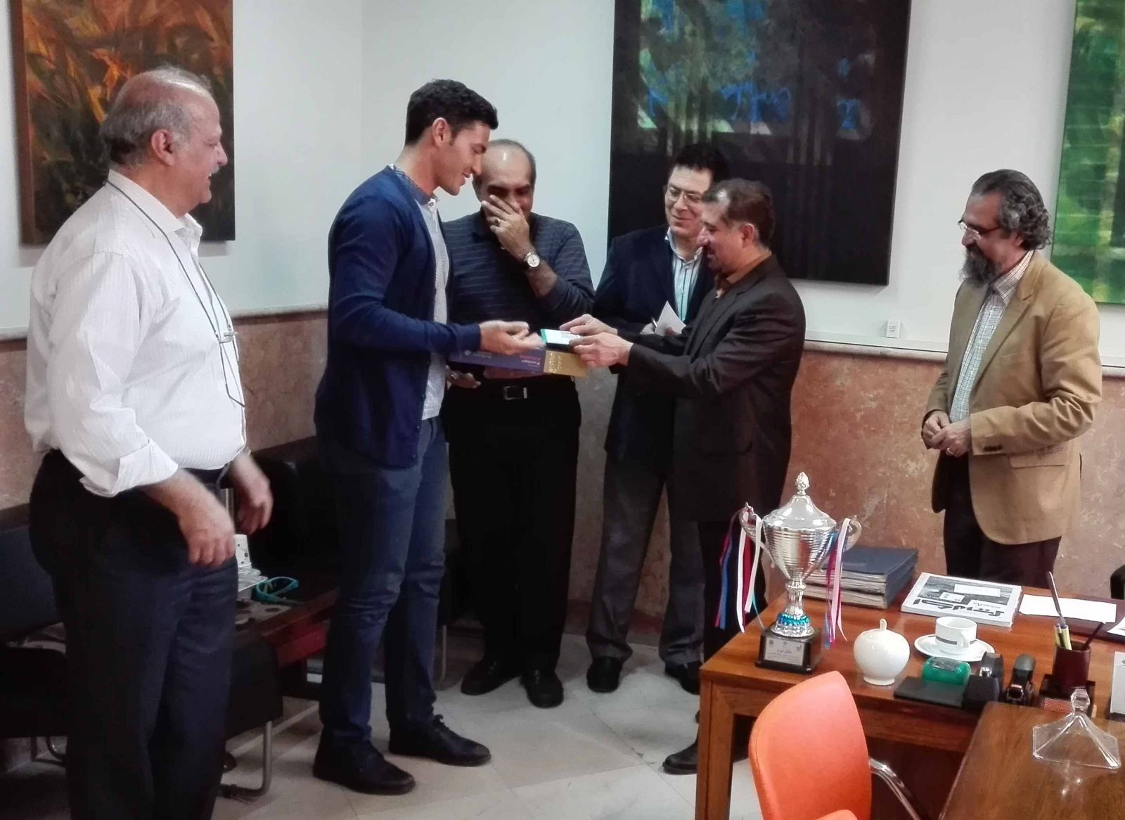در یک نشست رسمی و صمیمی در تاریخ ۹۵/۱۲/۱۵ جناب آقای امیر آقازاده بنفشه ورق دانشجوی رشته طراحی پارچه دانشگاه هنر، جام قهرمانی خود را که در مسابقات قایقرانی (روئینگ تک نفره) دانشجویان دانشگاههای منطقه یک کشور در مورخ ۹۵/۱۰/۱ کسب نموده بود، به معاونت دانشجویی اهداء کرد.