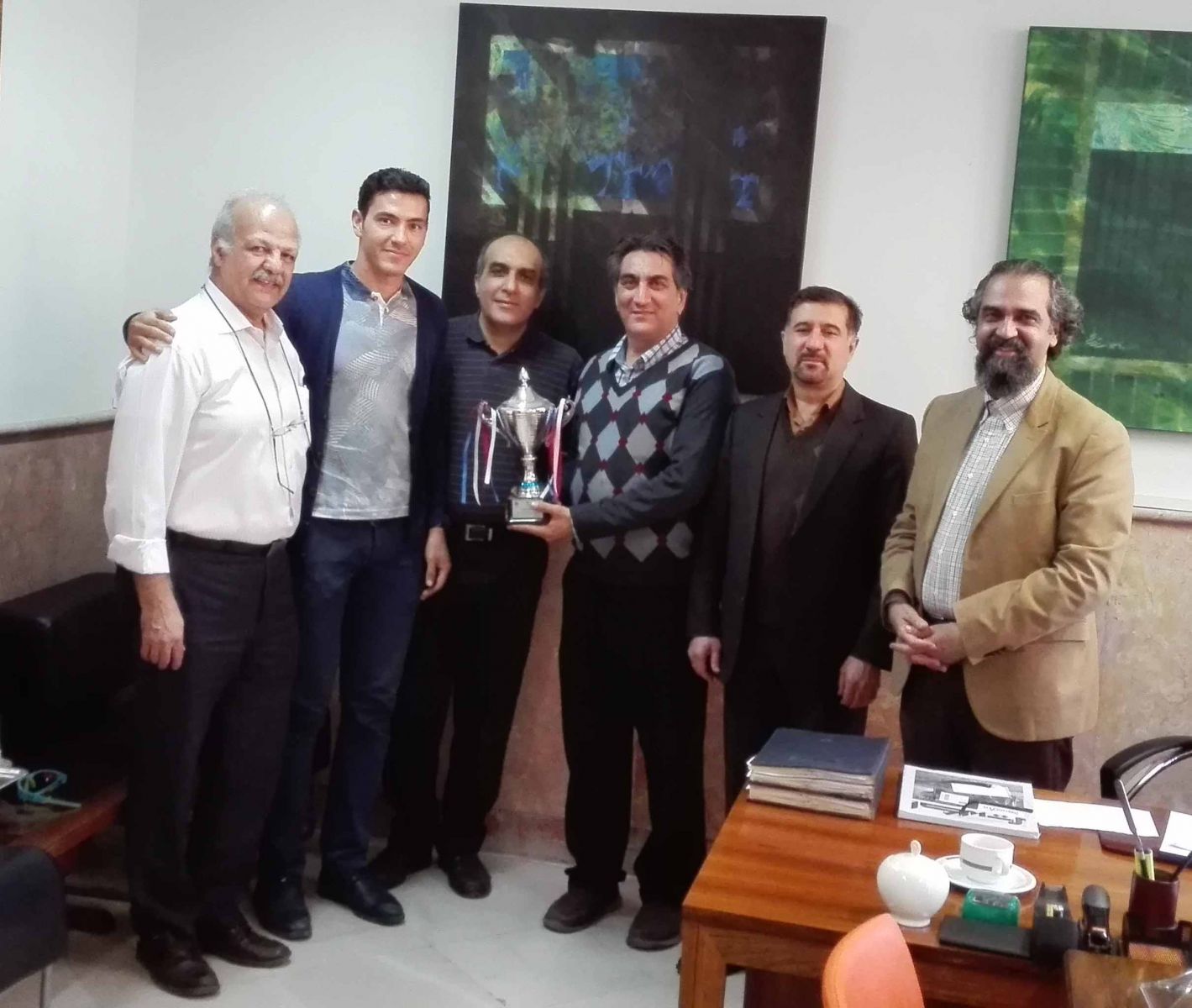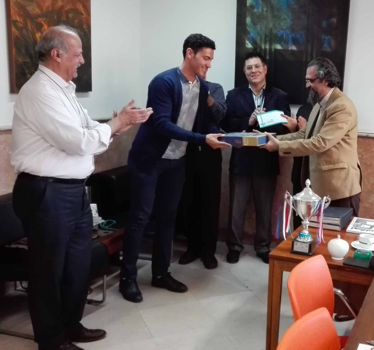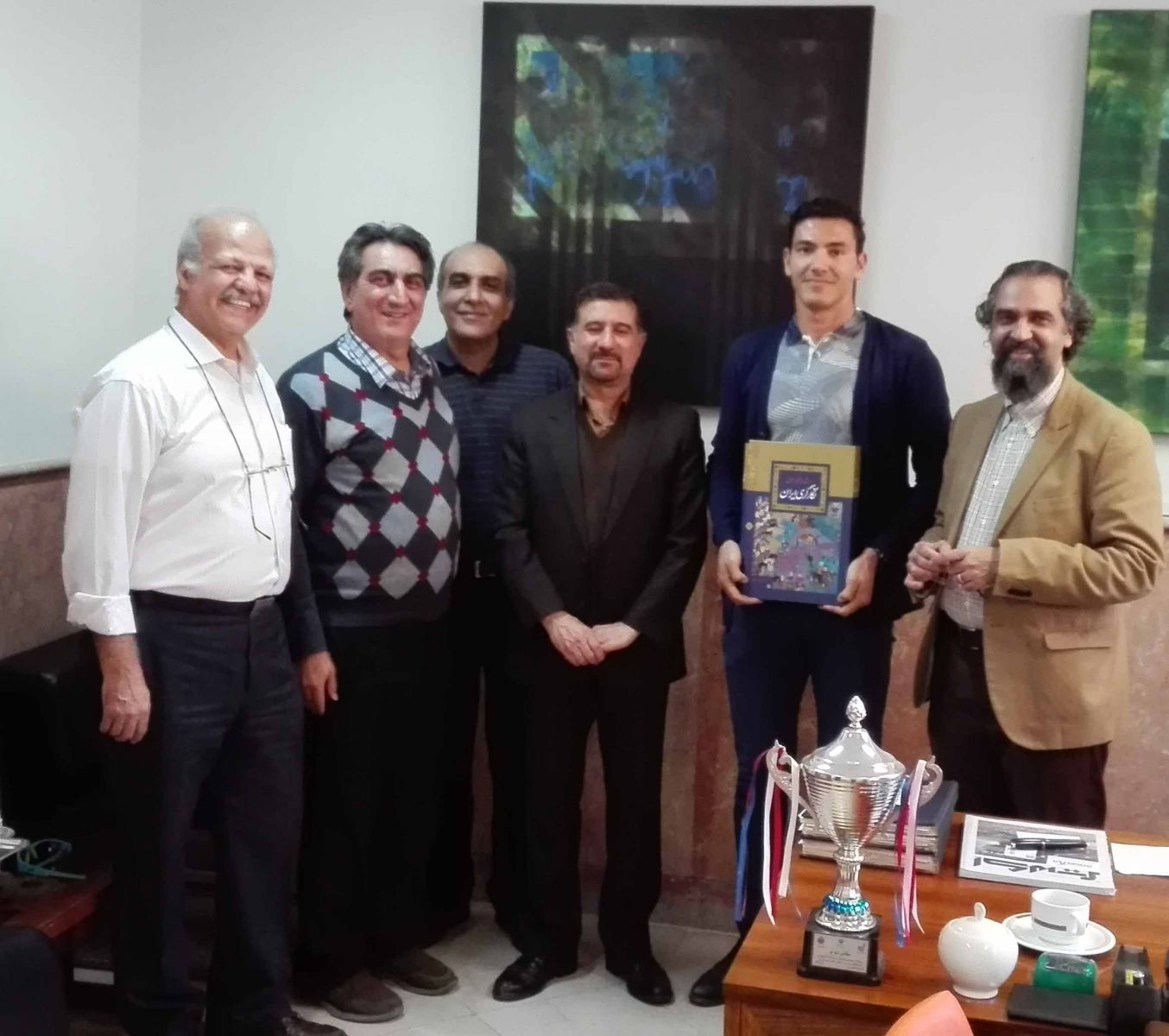در یک نشست رسمی و صمیمی در تاریخ ۹۵/۱۲/۱۵ جناب آقای امیر آقازاده بنفشه ورق دانشجوی رشته طراحی پارچه دانشگاه هنر، جام قهرمانی خود را که در مسابقات قایقرانی (روئینگ تک نفره) دانشجویان دانشگاههای منطقه یک کشور در مورخ ۹۵/۱۰/۱ کسب نموده بود، به معاونت دانشجویی اهداء کرد.