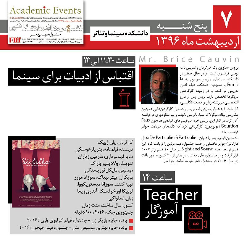 برنامه ی روز پنجشنبه ۷ اردیبهشت دانشکده ی سینما و تأتر ۰۶ اردیبهشت ۱۳۹۶ | ۲۲:۱۱ کد : ۹۵۳ رویدادها ارسال به دیگران نام شما ایمیل شما ایمیل دریافتکننده ارسال انصراف تعداد بازدید:۸۶۴ کارگاه بریس ساوین استاد مدرسه فیلم فمیس پاریس با موضوع اقتباس در سینما فیلم آموزگار به کارگردانی یان ژبیک